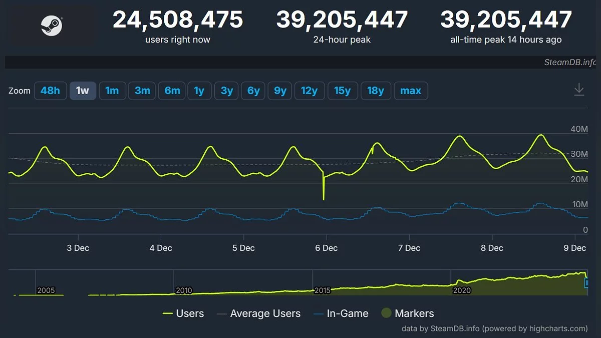 В Steam вновь был установлен новый рекорд по количеству пользователей, которые одновременно находились в статусе онлайн. В сервисе было зафиксировано 39,2 млн геймеров. Это произошло 8 декабря.