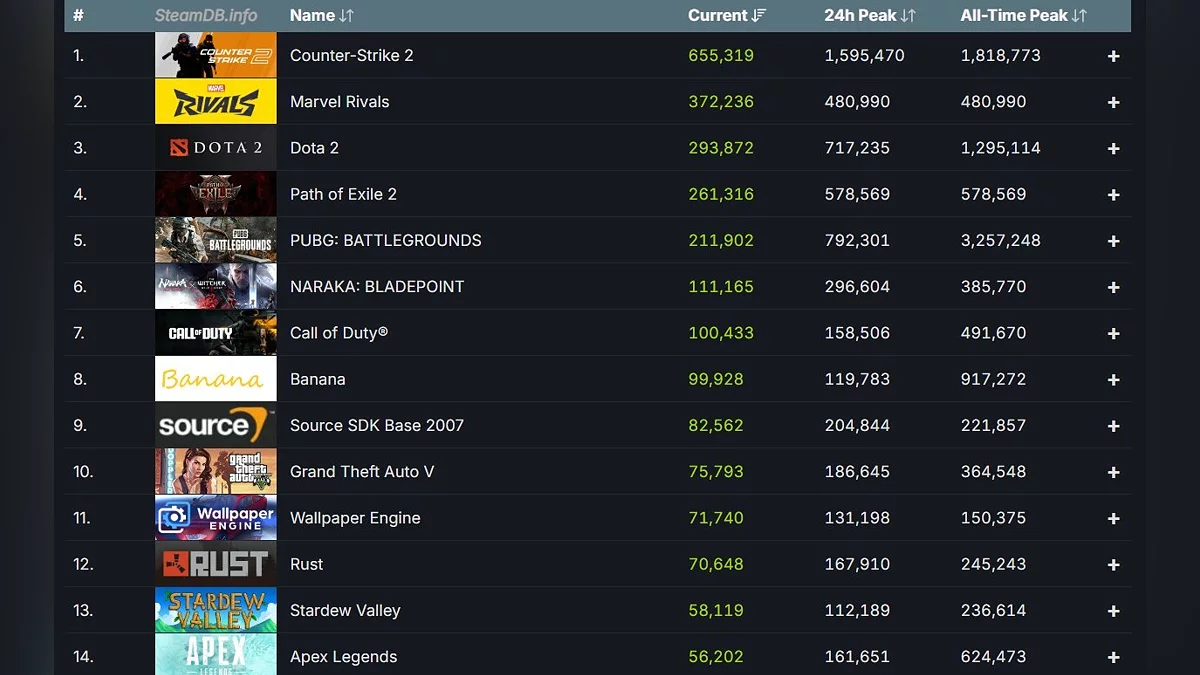 Что касается самых популярных игр, недавно в первую пятерку проектов по онлайну вырвались Marvel Rivals (пиковый онлайн — почти 481 тыс) и Path of Exile 2 (пиковый онлайн — 578 тыс игроков).