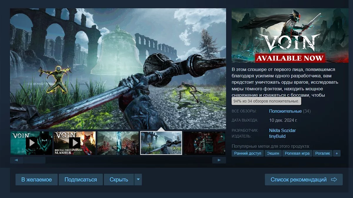 В раннем доступе Steam вышел слэшер от первого лица под названием VOIN, который был создан разработчиком-одиночкой Никитой Созидаром (Nikita Sozidar). Издателем выступила компания tinyBuild. Первые отзывы — положительные.