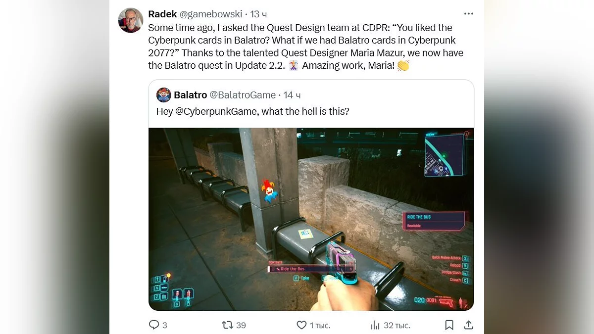 Некоторое время назад я спросил команду квест-дизайнеров в CDPR: «Вам понравились карты Cyberpunk в Balatro? Что если бы у нас были карты Balatro в Cyberpunk 2077?». Благодаря талантливому дизайнеру квестов Марии Мазур (Maria Mazur), у нас теперь есть квест Balatro в обновлении 2.2.Отличная работа, Мария!