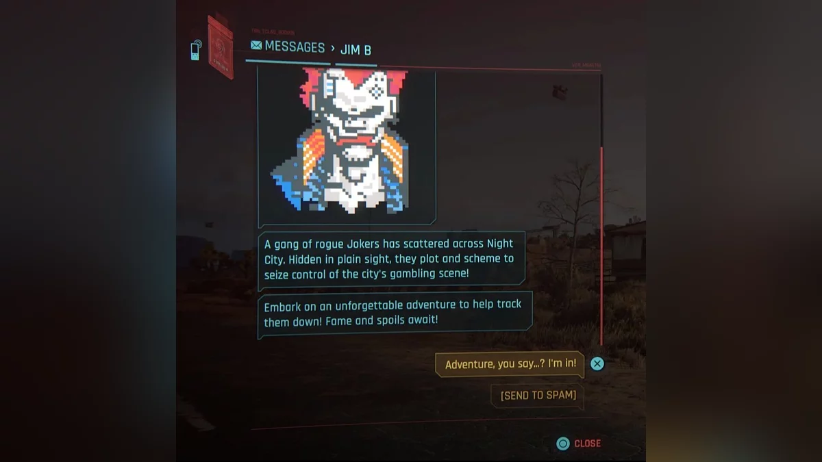Чтобы начать этот квест, персонажу должен написать персонаж по имени Джим Б. Он рассказывает, что на улицах Найт-Сити действует банда джокеров, которые плетут интриги и хотят стать королями азартных игр. Он предложит Ви выследить негодяев.