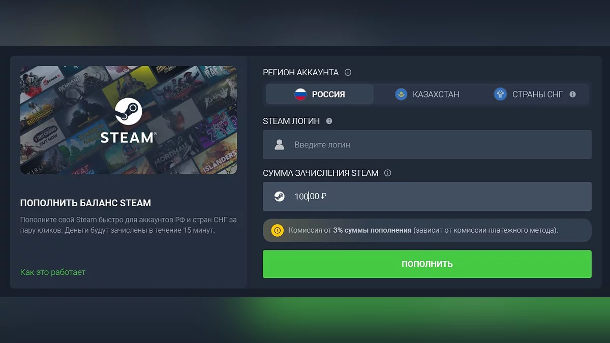 Кроме того, геймеры также могут пополнить баланс Steam (с 3% комиссией сервиса) на любую сумму от 100 руб.