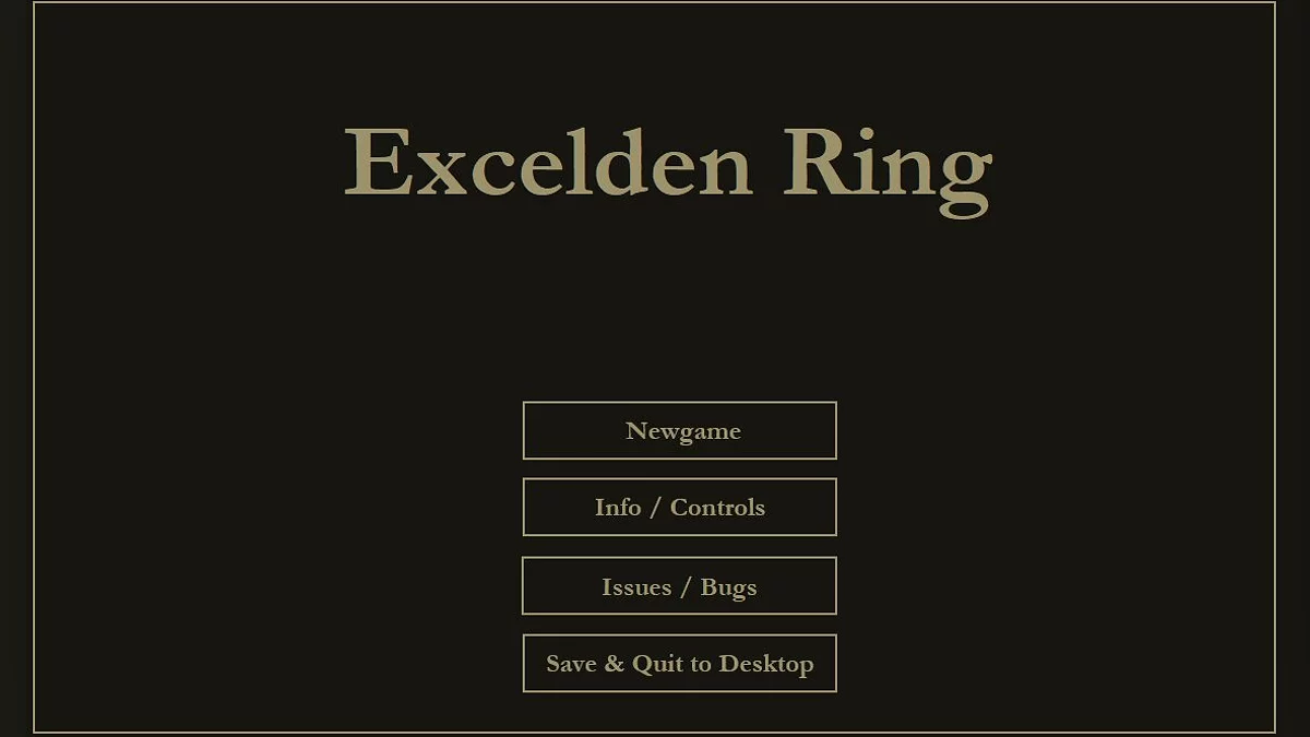 Реддитор с ником brighty360 воссоздал основные механики экшена, назвав свой проект Excelden Ring. Здесь есть почти всё необходимое: отрисованная вручную карта, более 60 видов оружия, свыше полусотни противников, полноценная система прокачки для разных боевых стилей, 25 комплектов брони, три класса, несколько заданий от NPC и четыре концовки. Отсутствует лишь один узнаваемый элемент — боссы. Управление осуществляется через WASD и Ctrl+E.