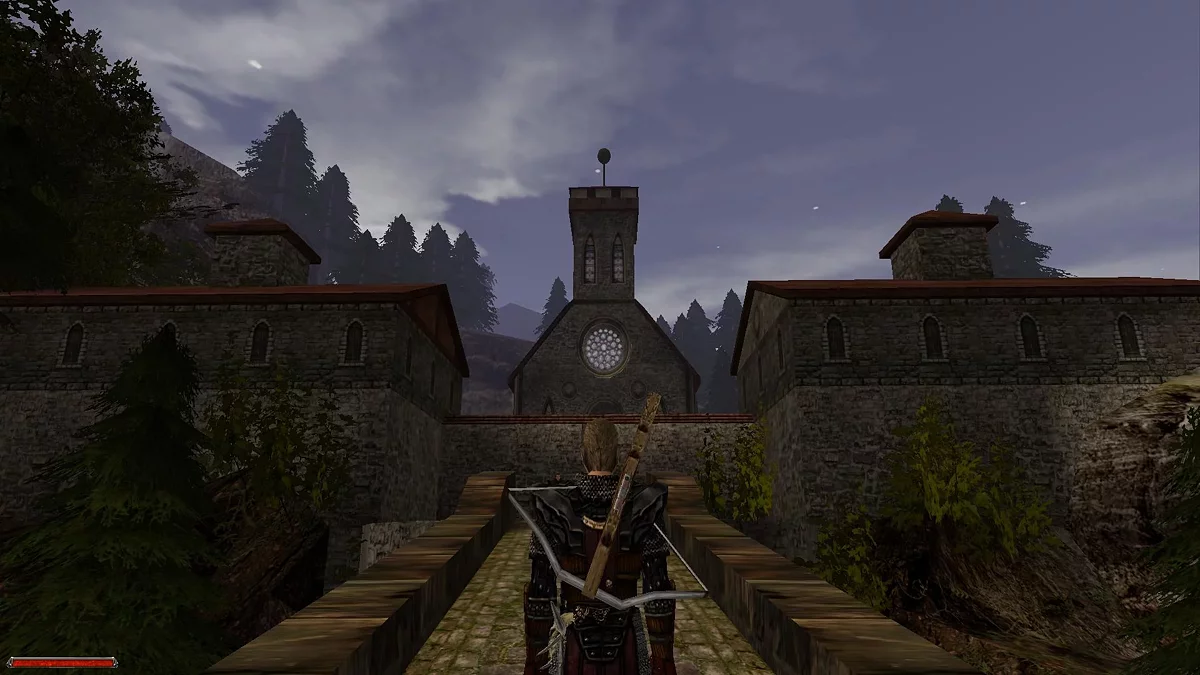 В оригинале игрок как посетить монастырь, так и присоединиться к ордену магов Огня и стать одним из местных обитателей. Правда, для этого придётся заплатить немалую сумму. Найти локацию можно в центре острова Хоринис рядом с водопадом. Влада Красюк осовременила здание, придав ему готический стиль, а также проработала окружение монастыря в виде моста, скал и леса. Для работы использовались ассеты скульптора MichalSornat.