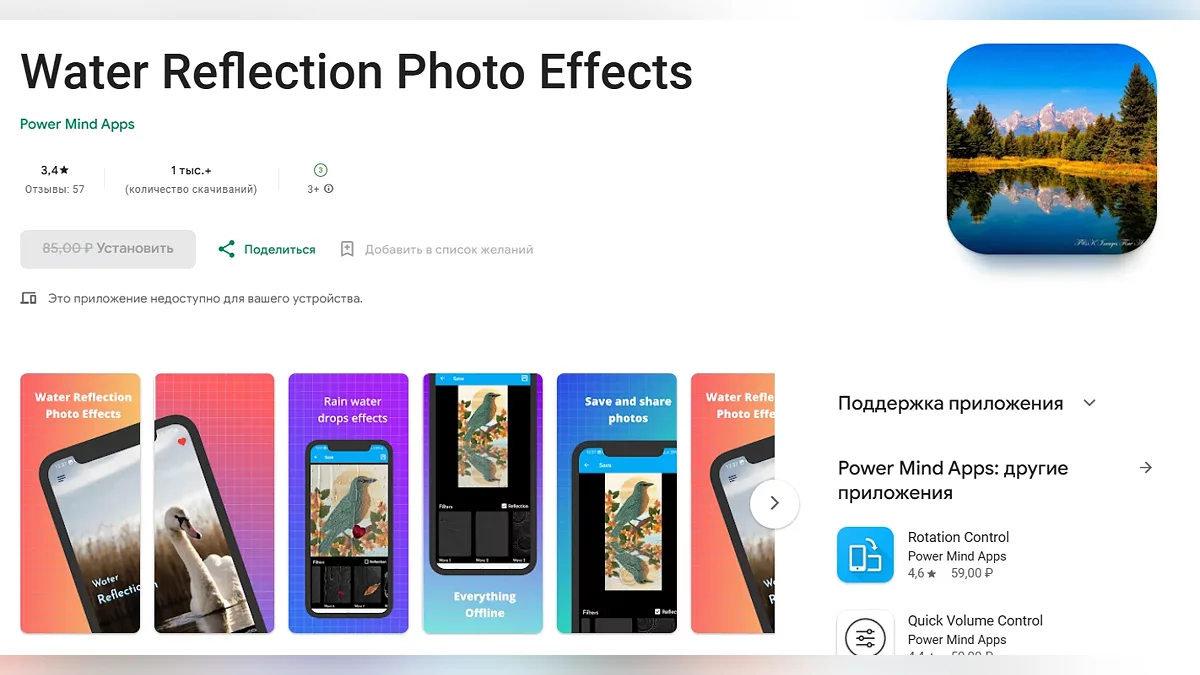 - Water Reflection Photo Effects — программа, позволяющая придавать фотографиям эффекта отражения воды (загрузить бесплатно).