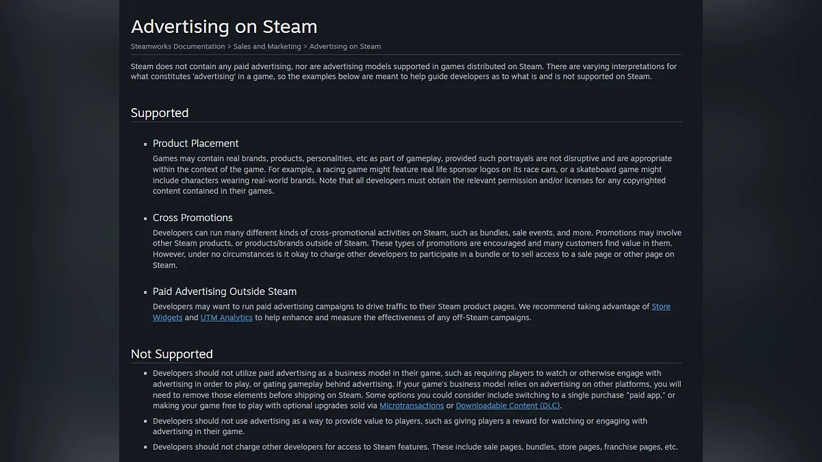 В разделе «Реклама в Steam» в документации Steamworks появилось подобное разъяснение, какие виды рекламы поддерживаются и не поддерживаются на площадке. Отдельно администрация сервиса отметила игры, бизнес-модель которых построена на просмотре роликов для дальнейшего прохождения. Valve напомнила, что подобные проекты будут удаляться с площадки, если разработчики не уберут этот элемент монетизации.