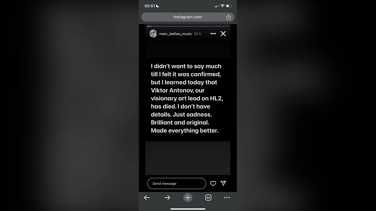 Оригинальная новость: по сети разлетелся скриншот из сторис Марка Лэйдлоу, в котором тот оповестил подписчиков об утрате. К сожалению, Instagram* удаляет такие посты по истечении 24 часов, поэтому подтвердить подлинность изображения пока невозможно. Сам сценарист пока не прокомментировал ситуацию, официальных сообщений о смерти Виктора Антонова также не поступало.