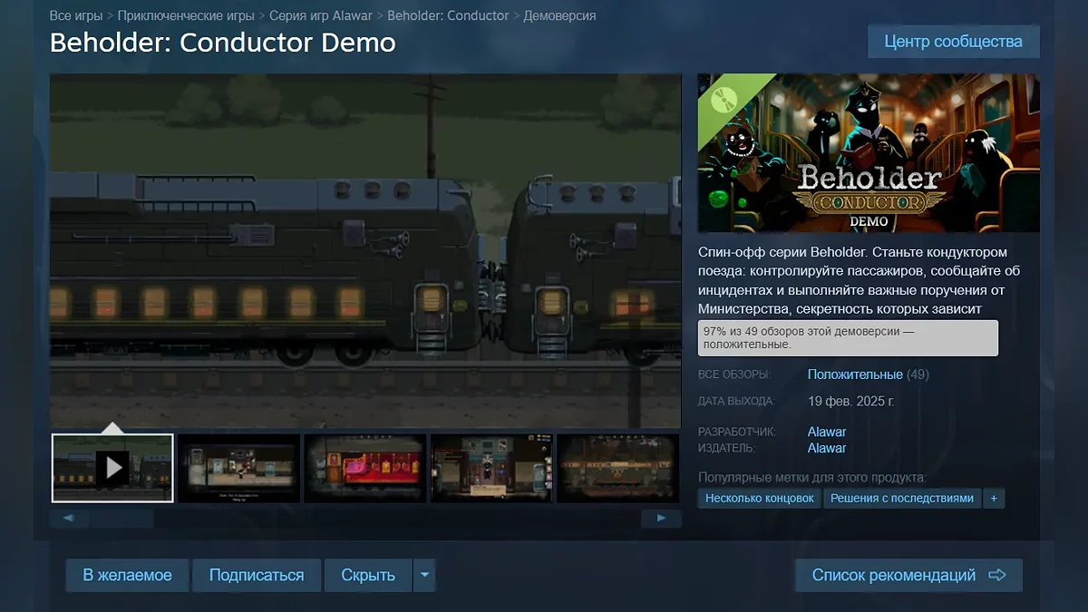 Компания Alawar сообщила о выпуске демоверсии Beholder: Conductor, благодаря чему геймеры могут предварительно опробовать игру совершенно бесплатно. Авторы также опубликовали новый трейлер.