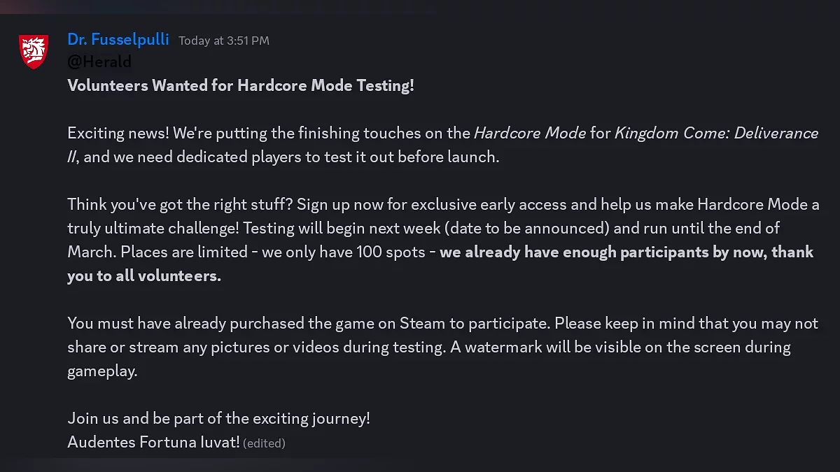 Warhorse Studios сообщила, что уже на следующей неделе стартует тестирование хардкорного режима для Kingdom Come: Deliverance 2. Оно продлится до конца марта, а само обновление ожидается в апреле.