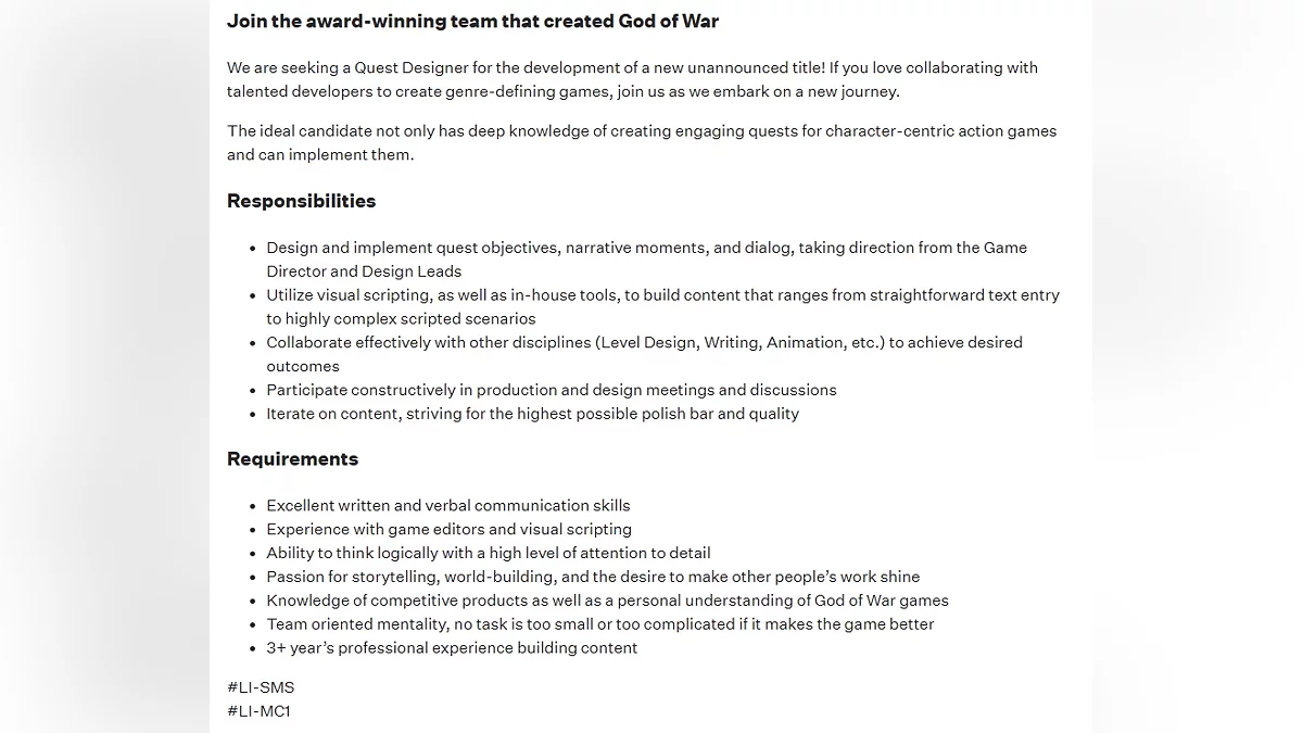 В команду ищут дизайнера квестов и старшего нарративного дизайнера для совершенно новой, не анонсированной игры. Примечательно, что в обоих случаях в списке требований указан следующий пункт: «Знание конкурентоспособных продуктов, а также личное понимание игр God of War».