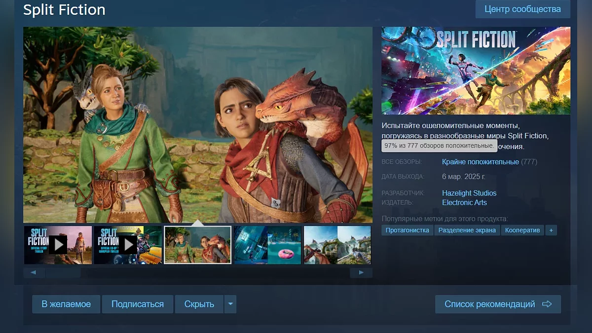 Совсем недавно состоялся релиз Split Fiction — новой кооперативной приключенческой игры от Hazelight Studios (создатели A Way Out и It Takes Two). В Steam проект уже получил первые 700 отзывов. На момент написания новости рейтинг составляет 97%.