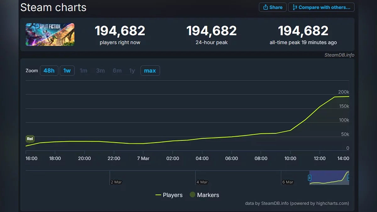 Всего за сутки Split Fiction от создателей It Takes Two вырвалась на второе место по онлайну среди проектов Electronic Arts. По данным SteamDB, на момент написания новости максимальное число игроков перевалило за 190 тысяч.