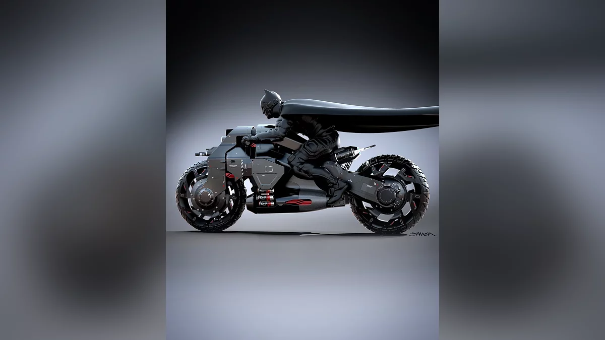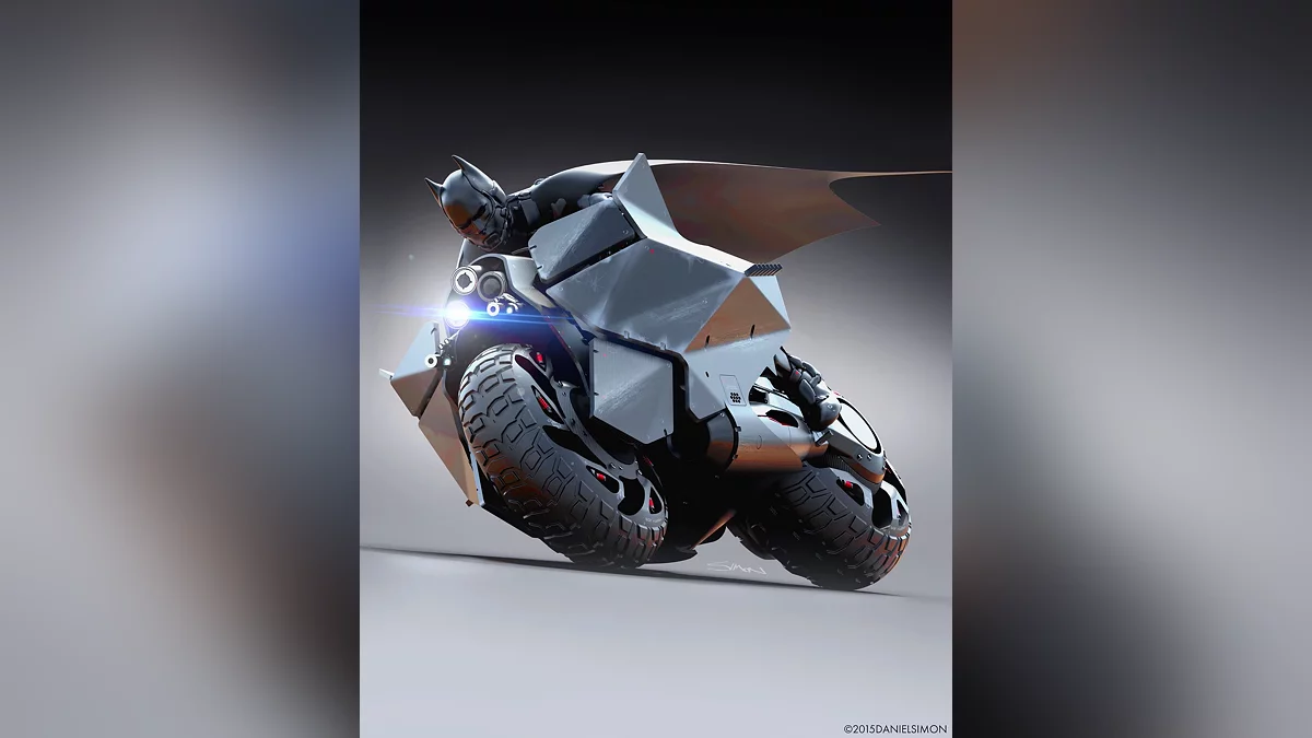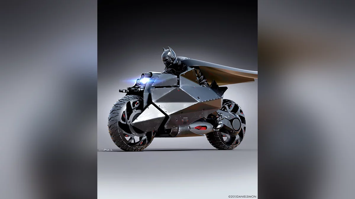 Художник Дэниел Симон (Daniel Simon) поделился в соцсетях изображениями мотоцикла, на котором мог разъезжать Бэтмен. Одно из улучшений брони предполагало, что пластины будут облегать корпус Бэтбайка, как крылья летучей мыши. На самом концепт-арте, вероятно, изображён Дэмиан Уэйн, занявший место Тёмного Рыцаря после отца.