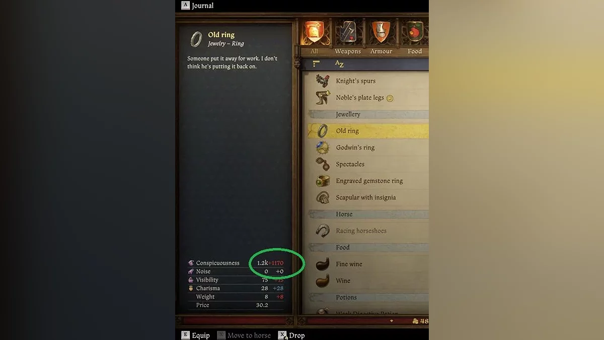 В мире игры можно обнаружить старое кольцо, которое на первый взгляд ничем не примечательно. Однако в характеристиках можно увидеть, что оно повышает параметр «Заметность» на 1170 очков, что само по себе абсурдно. Зато «Харизма» прирастает на 28 уровней. А весит находка целых 8 пунктов.