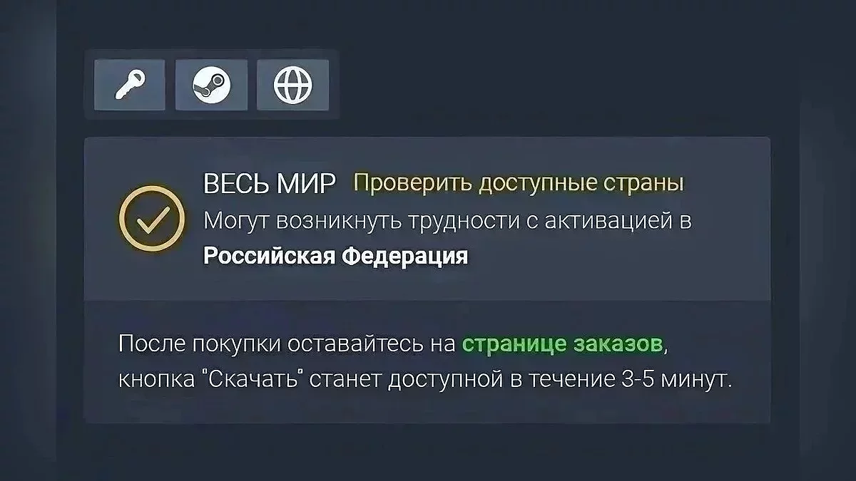 В связи с санкциями многие издатели удалили свои игры из российского Steam. В таком случае с активацией ключа в этом регионе могут возникнуть проблемы. Соответствующая надпись будет в описании товара: