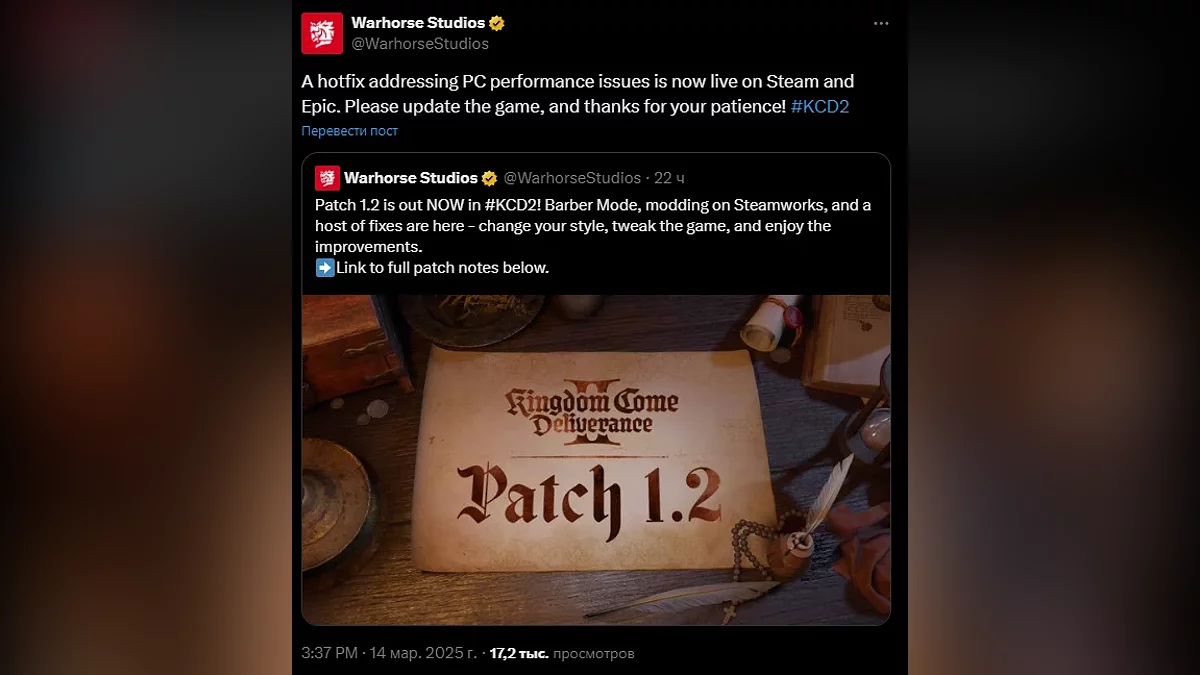Вслед за масштабным обновлением 1.2 для Kingdom Come: Deliverance 2 разработчики выпустили свежий хотфикс. Он должен исправить проблемы с производительностью PC-версии.