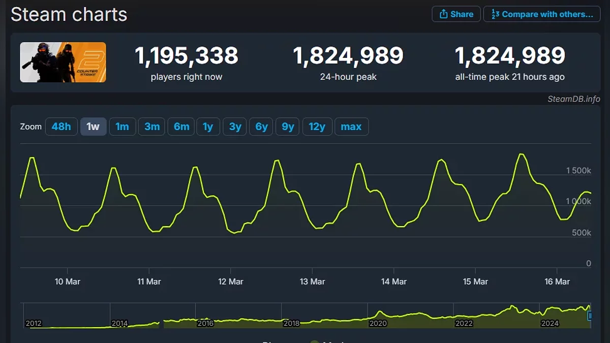 Тем временем в Counter-Strike 2 на пике сыграло свыше 1,8 миллионов пользователей, о чём сообщил сервис SteamDB.