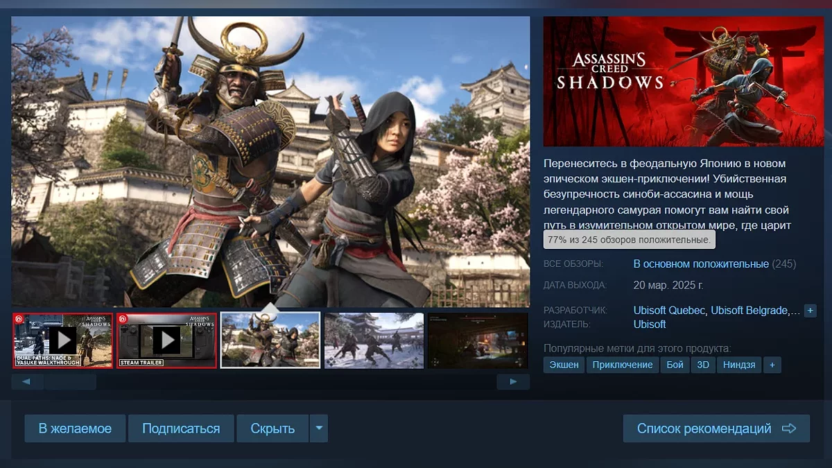 Assassin's Creed Shadows вышла на PC и консолях — в Steam уже появились первые отзывы игроков