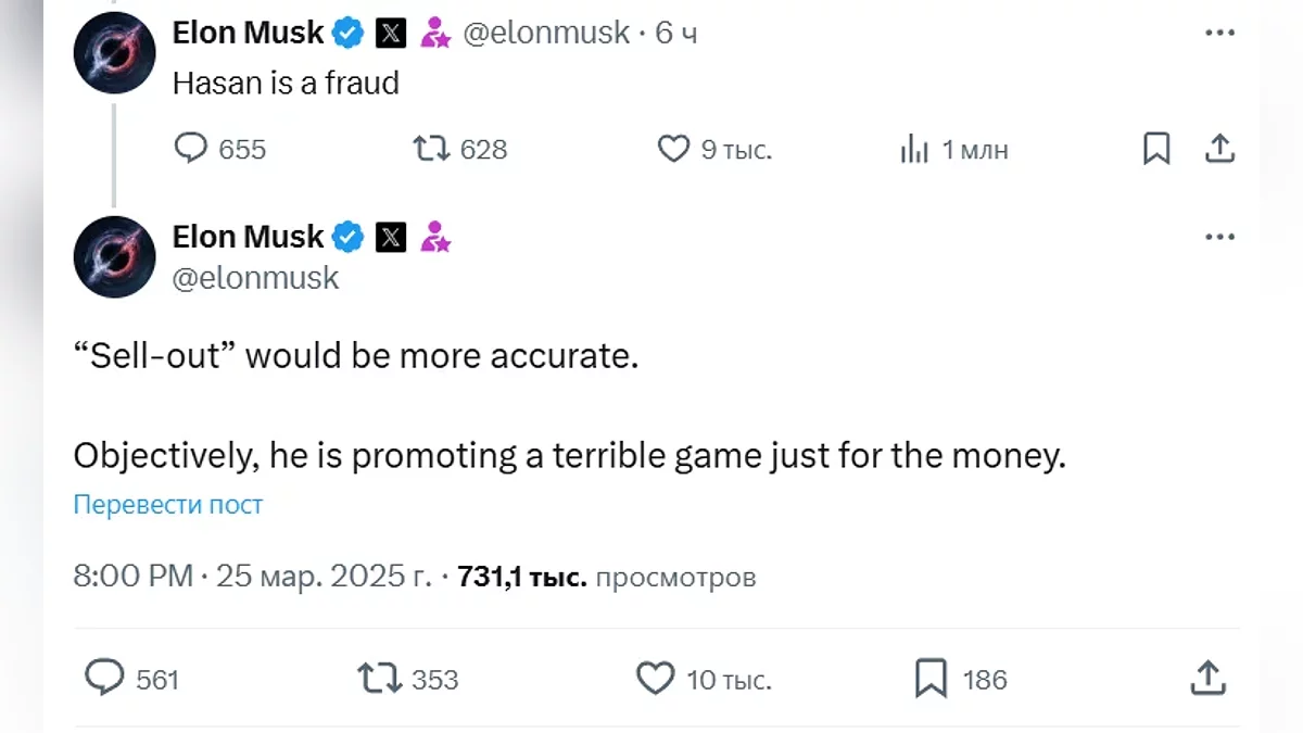 Американский миллиардер заявил следующее: «Хасан — мошенник. “Продажный” было бы точнее. Объективно говоря, он рекламирует ужасную игру только ради денег».