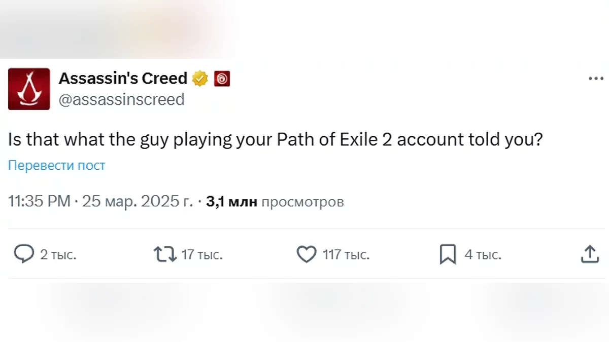 На слова Илона Маска сразу же отреагировал официальный аккаунт Assassin's Creed, который написал: «Это тебе сказал тот парень, который играет на твоём аккаунте в Path of Exile 2?» Вероятно, это намек на то, что ранее Илона Маска заподозрили в нечестной прокачке аккаунта Path of Exile 2.