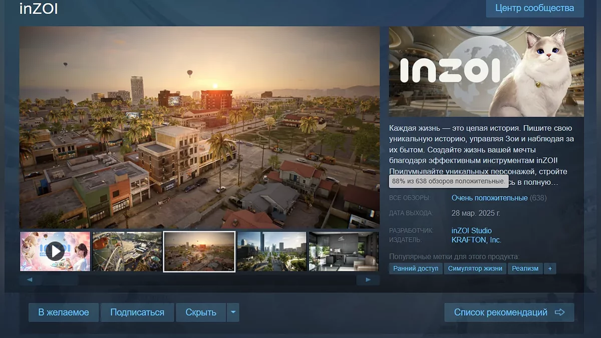 После выхода симулятора жизни inZOI в раннем доступе Steam прошло всего несколько часов, но игра уже успела получить более 600 отзывов. На момент написания новости проект имеет рейтинг 88%.