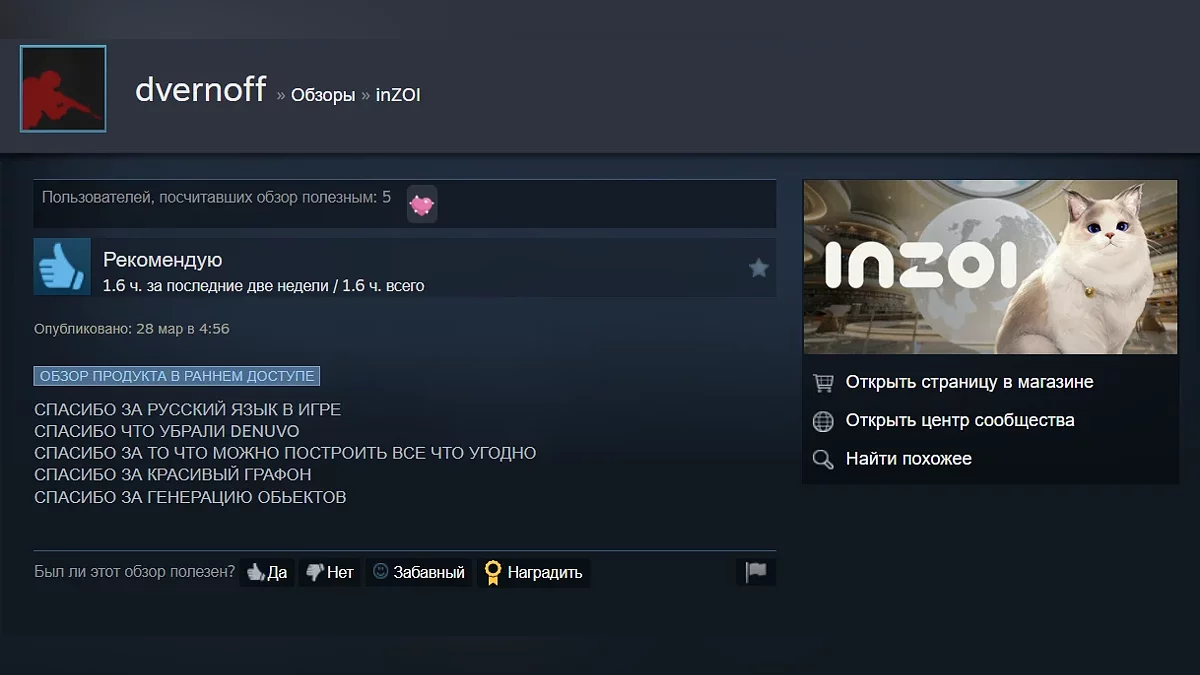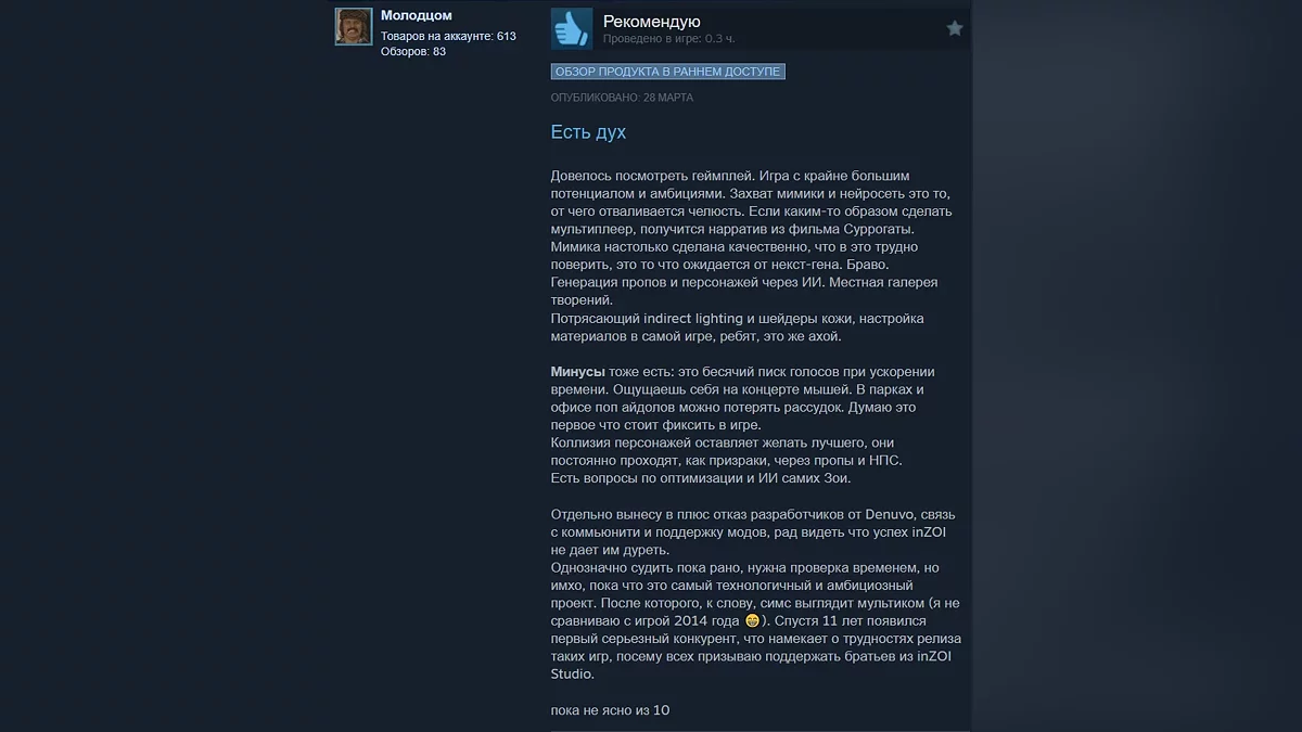 Многие игроки солидарны во мнении, что у inZOI есть огромный потенциал. К плюсам относят наличие ИИ-функций и большое количество настроек. К минусам некоторые геймеры относят разве что не самую лучшую оптимизацию.