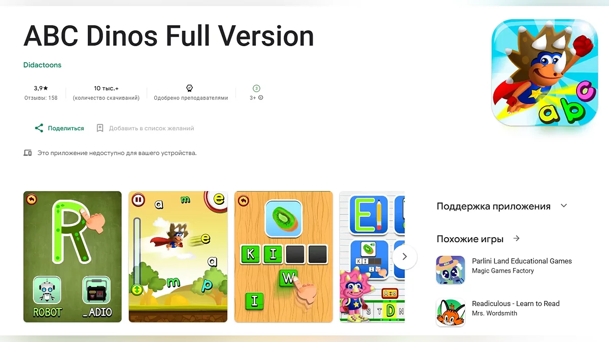 - ABC Dinos Full Version — детская игра про чтение и написание слов (загрузить бесплатно);