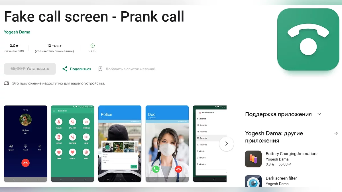 - Fake call screen — Prank call — программа, которая имитирует экран входящего вызова, чтобы безопасно выйти из таких ситуаций, как раздражающие разговоры или скучные встречи (загрузить бесплатно).