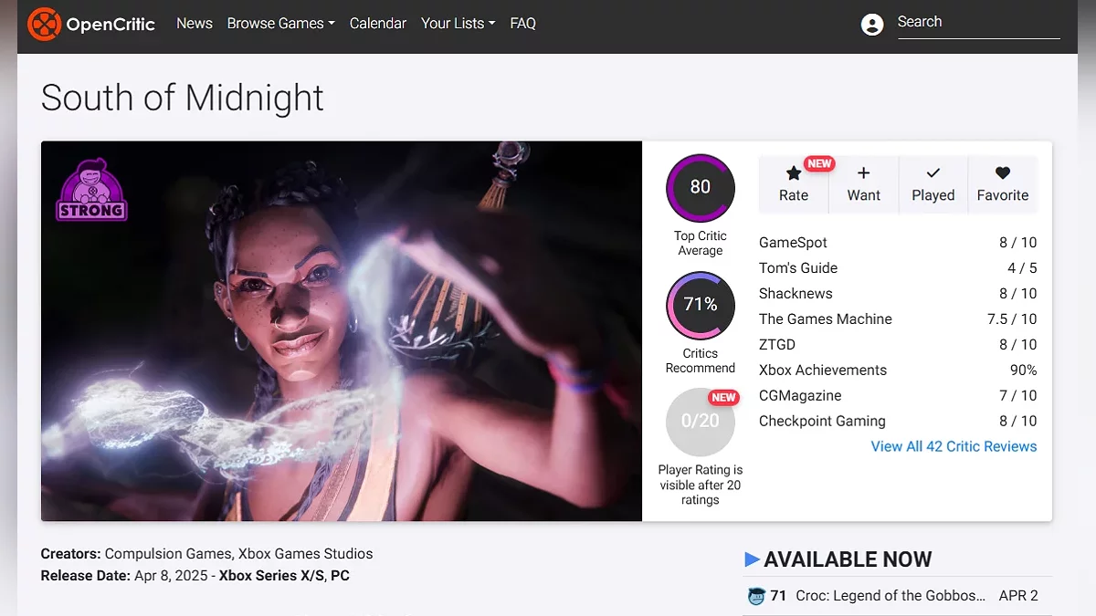 Сегодня спало эмбарго на обзоры South of Midnight от студии Compulsion Games, подарившей миру We Happy Few. На момент написания новости игра получила 76/100 баллов на Metacritic и 80/100 баллов на Open Critic.