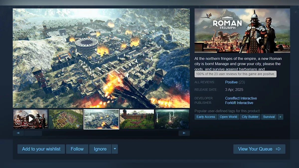 Компания-издатель Forklift Interactive и студия-разработчик Coreffect Interactive выпустили в раннем доступе Steam игру про Римскую империю под названием Roman Triumph: Survival City Builder. Первые отзывы — положительные.