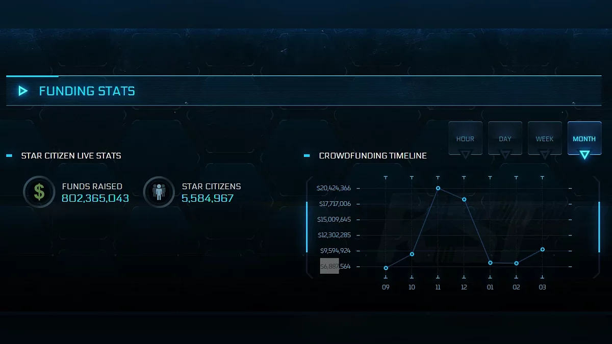 Если верить официальному сайту Cloud Imperium Games, игроки продолжают активно поддерживать проект пожертвованиями — только ежедневные взносы варьируются от $235 до $345. А за последние полгода компания каждый месяц получала не менее $6,8 миллиона. В основном разработка финансируется за счёт микротранзакций в виде платного доступа к альфа-версии, подписок и внутриигровых покупок.