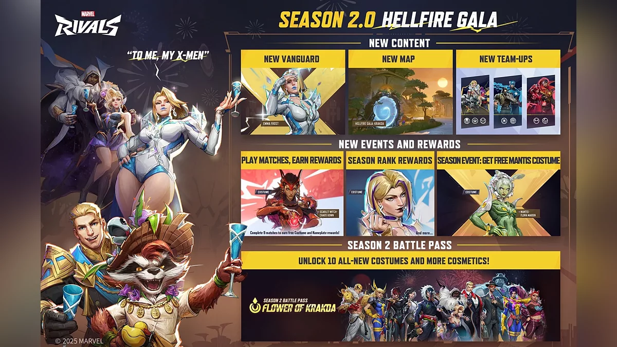 Второй сезон добавляет Эмму Фрост из команды Людей Икс в качестве «Защитника», новую карту — живой остров Кракоа, ивенты с различными наградами, включая костюмы для Алой Ведьмы, Эммы Фрост и Мантис. Игроки также смогут открыть новые скины и косметику в боевом пропуске второго сезона для 10 персонажей, в числе которых Человек-паук, Чёрная вдова, Капитан Америка и другие.