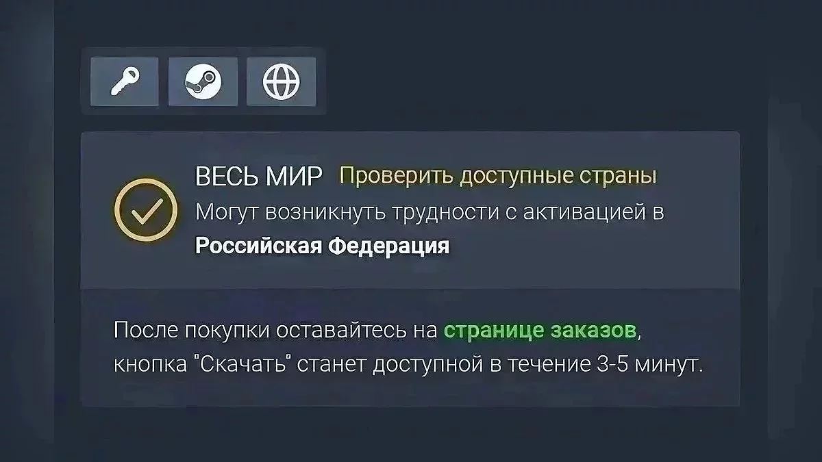 В связи с санкциями многие издатели удалили свои игры из российского Steam. В таком случае с активацией ключа в этом регионе могут возникнуть проблемы. Соответствующая надпись будет в описании товара: