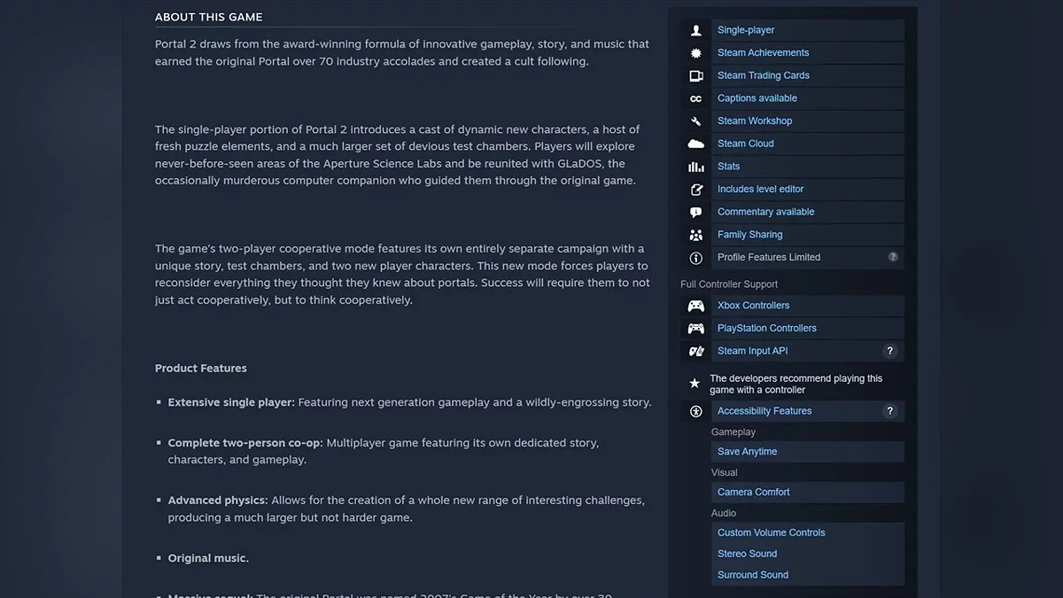 Valve объявила о внедрении в Steam новых опций, позволяющих игрокам заранее узнать о доступности важных функций в играх. Разработчики смогут отмечать на страницах своих проектов сведения об удобстве прохождения и настройке под различные потребности геймеров. Все игры в Steam пройдут через опросник, где по четырем категориям — «Геймплейные опции», «Звуковые опции», «Опции отображения» и «Опции ввода» — будут выбираться доступные функции.