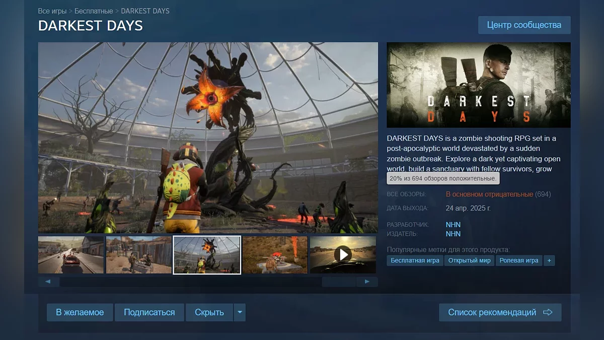 В Steam стал доступен RPG-выживач Darkest Days, который распространяется бесплатно. Первые отзывы от геймеров в основном отрицательные. К примеру, на момент написания новости проект имеет рейтинг 20%. К слову сейчас игра находится в стадии беты.