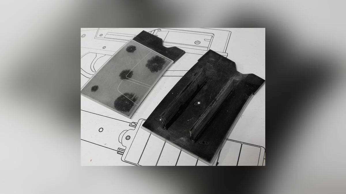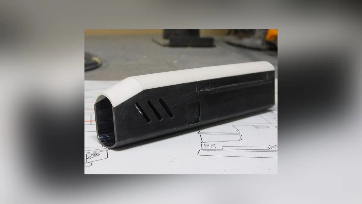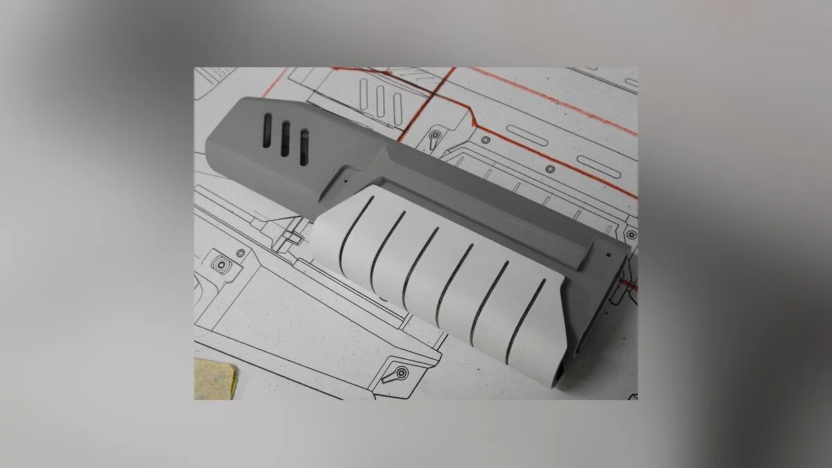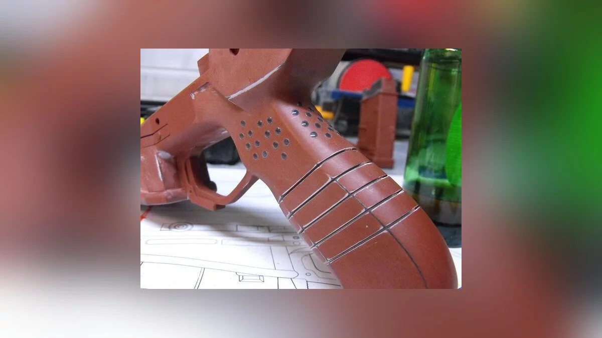 Лазерный резак использовался для создания 90% оружейной обоймы. Передние и задние объемные секции создавались путем сгибания и последующего приклеивания стирола в нужные места.