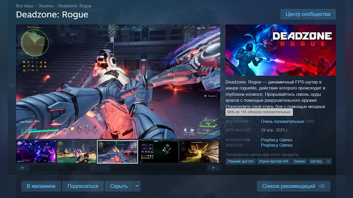 Компания Prophecy Games выпустила в раннем доступе на PC космический шутер от первого лица с элементами рогалика Deadzone: Rogue. Первые отзывы очень положительные (рейтинг 88% на момент написания новости).