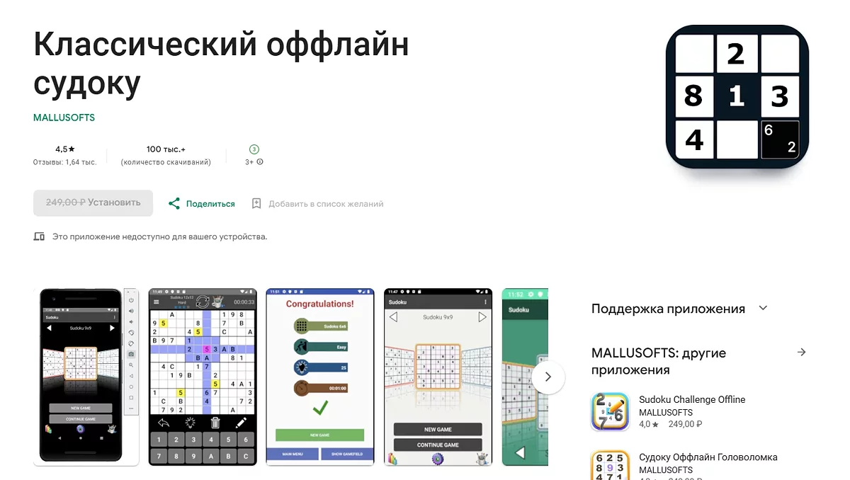- Classic Offline Sudoku — цифровая версия «Судоку», в которой есть четыре различных типа досок с четырьмя уровнями сложности (загрузить бесплатно);