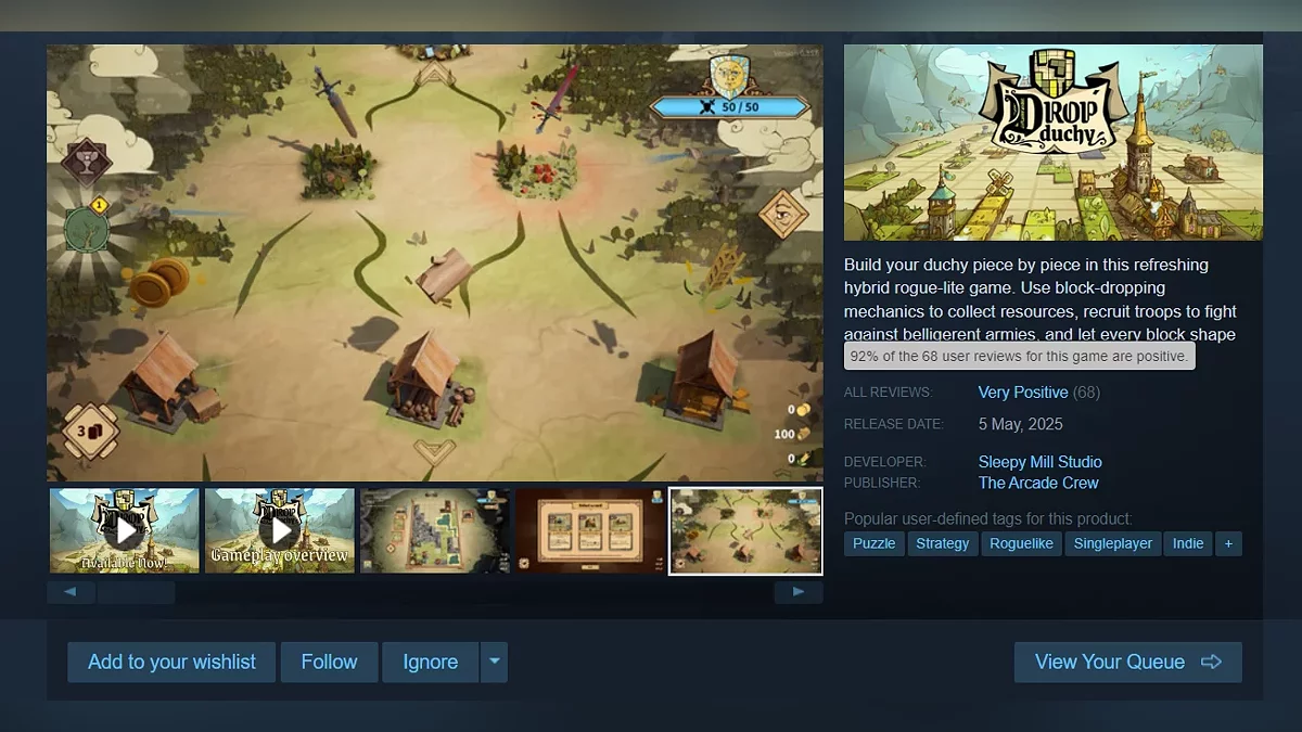 Компания-издатель The Arcade Crew и студия-разработчик Sleepy Mill выпустили на PC рогалик под названием Drop Duchy, который также объединяет в себе жанры головоломки, градостроения и карточной игры. В Steam проект получил очень положительные отзывы.