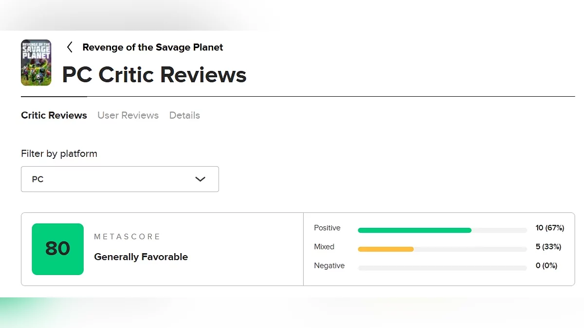 Приключенческий экшен Revenge of the Savage Planet получил в основном высокие оценки от прессы. На момент написания новости проект имеет 80 баллов на Metacritic. Пользовательская оценка будет сформирована позже.