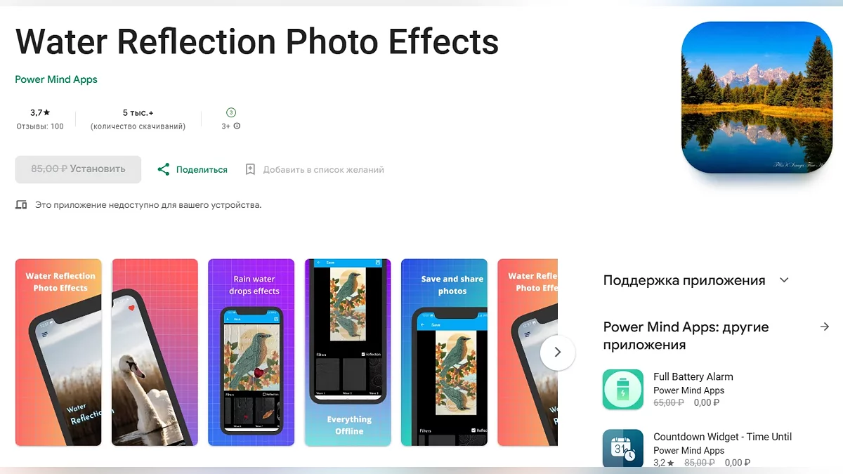 - Water Reflection Photo Effects — программа, которая позволяет добавить фотоэффекты отражения воды к своим снимкам (загрузить бесплатно);