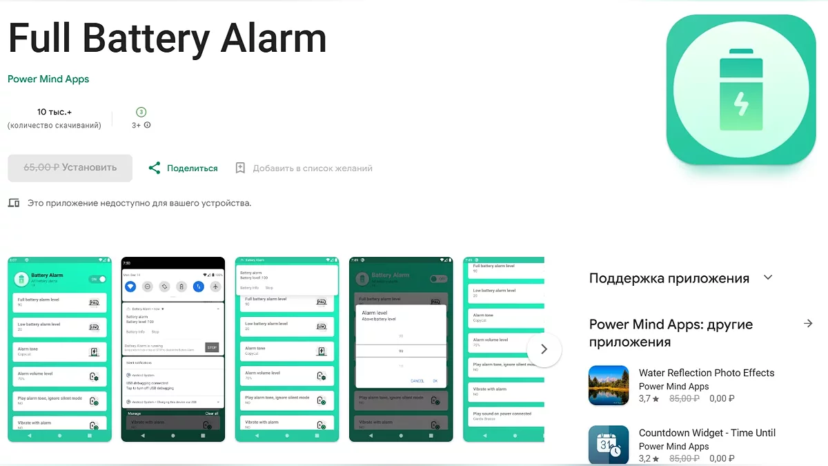 - Full Battery Alarm — программа, которая позволяет установить уведомление для зарядки батареи (загрузить бесплатно).