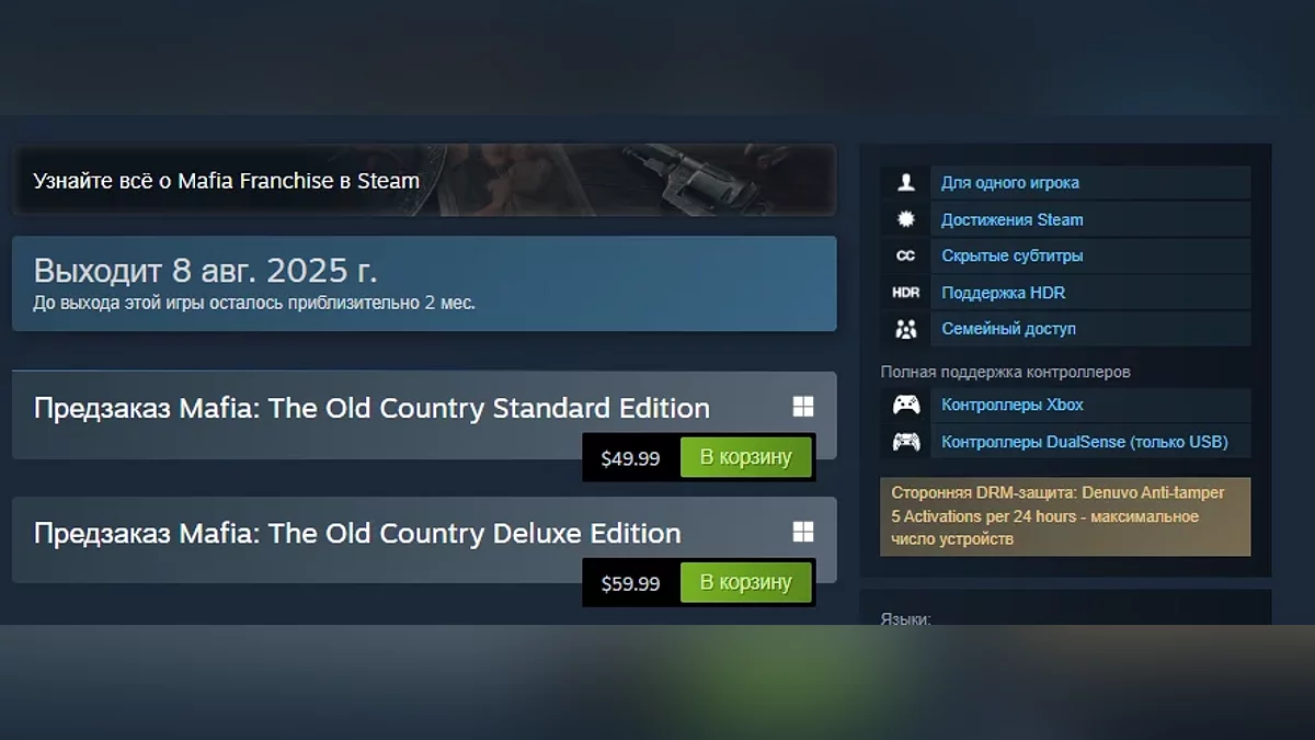 Mafia: The Old Country от студии Hangar 13 официально получит антипиратскую защиту Denuvo. Подтверждение можно найти на странице игры в Steam.
