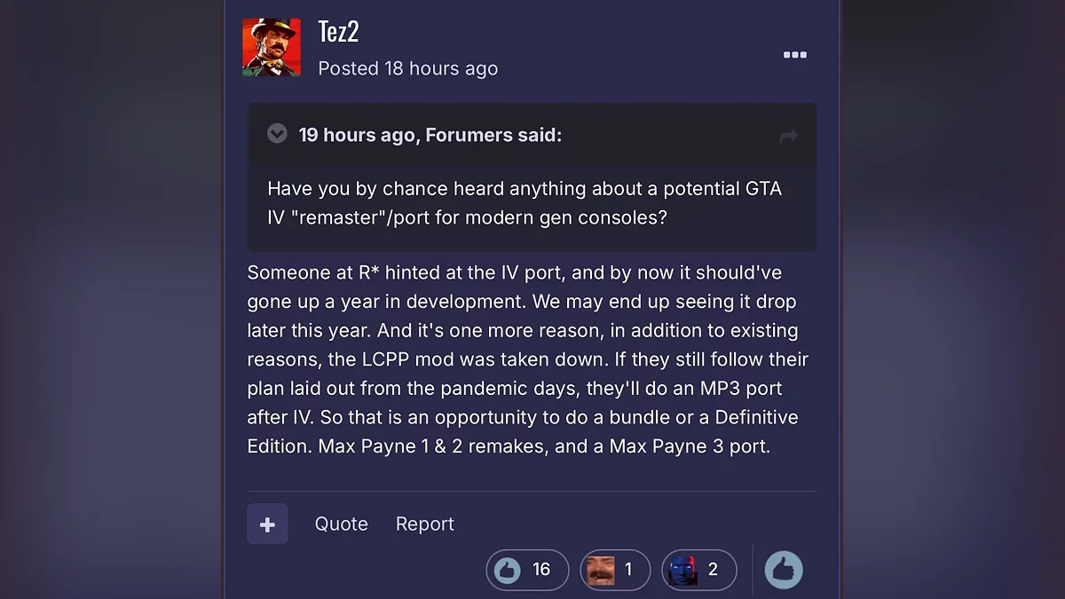 Предположительно, Rockstar уже около года разрабатывает порт GTA 4 для актуальных устройств. По этой же причине, считает Tez2, был заблокирован мод для Grand Theft Auto 5, который переносит Либерти-Сити на движок поновее. Не исключено, что студия решила выпустить переиздание, чтобы приобщить новую аудиторию к истории города — в GTA 6 упоминается, что мать Люсии Каминос родом из Либерти-Сити.