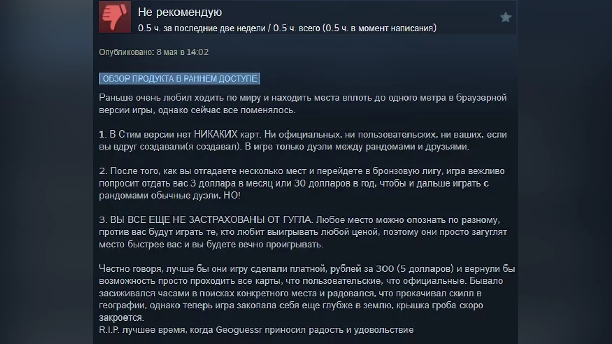 На прошлой неделе, 8 мая, состоялся бесплатный релиз GeoGuessr в раннем доступе Steam, чего поклонники браузерной игры ждали довольно долго. Однако тут же выяснилось, что геймерам предлагают только доступ к самому низкому уровню с ботами вместо живых игроков, а для остального контента придётся покупать подписку стоимостью в $2.50 в месяц. Приобрести полную версию нельзя.