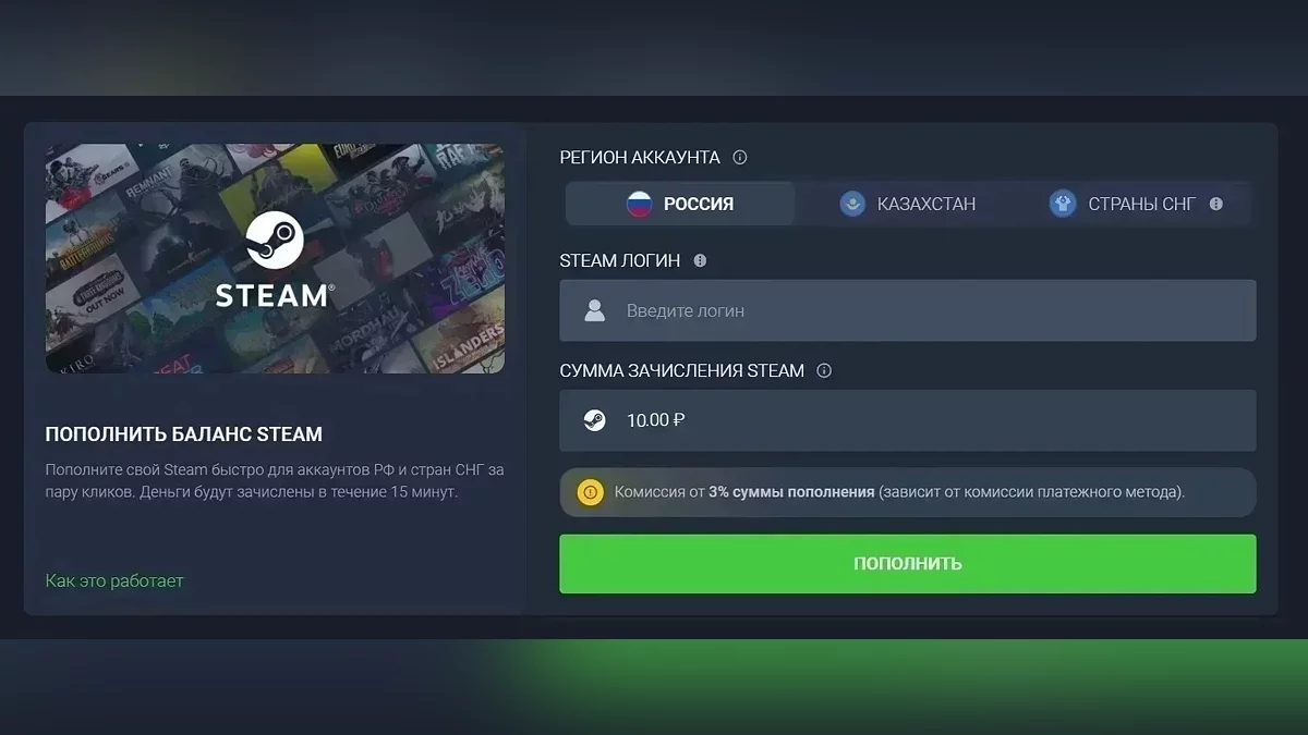 Кроме того, геймеры также могут пополнить баланс Steam (с 3% комиссией сервиса) на любую сумму от 10 руб.
