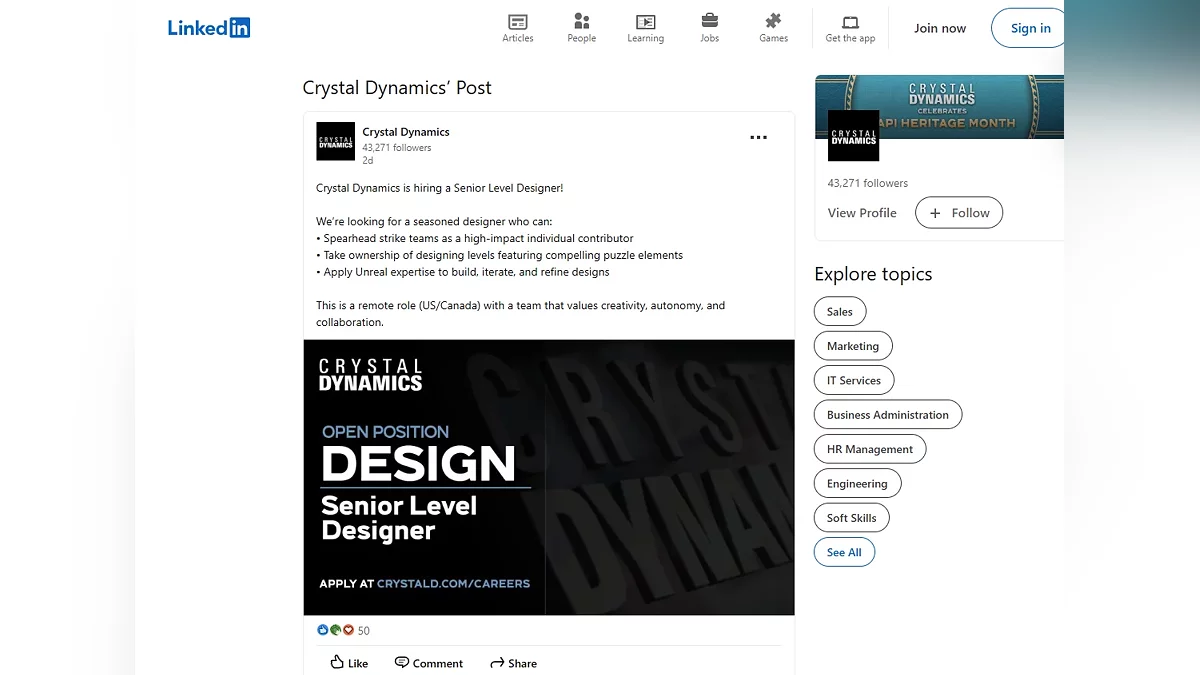Пользователь Reddit с ником somethingisnotwight обратил внимание на вакансию на LinkedIn, которую запостил директор по производству, работающий над Tomb Raider. Компания ищет старшего дизайнера уровней, который возглавит «ударные группы», а также займётся созданием уровней с головоломками и различными улучшениями проектов.