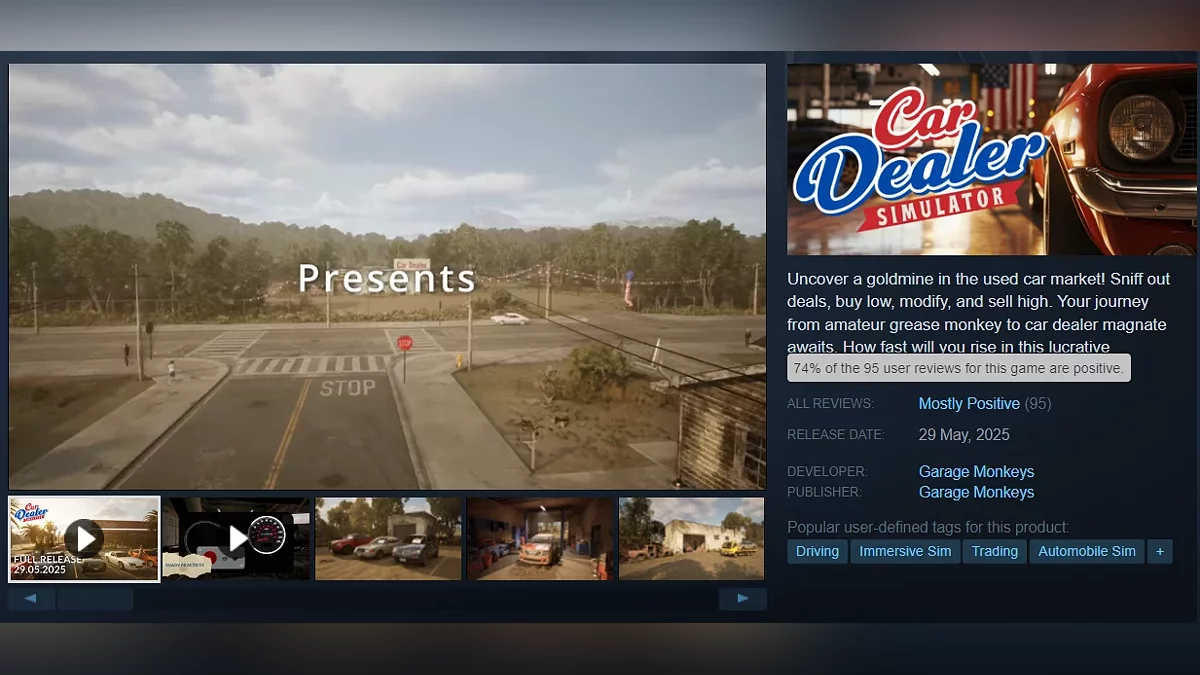 Независимая студия Garage Monkeys выпустила в Steam игру под названием Car Dealer Simulator. Это симулятор, в котором игроку предстоит отыгрывать роль продавца автомобилей. Первые отзывы в основном положительные (рейтинг 74%).