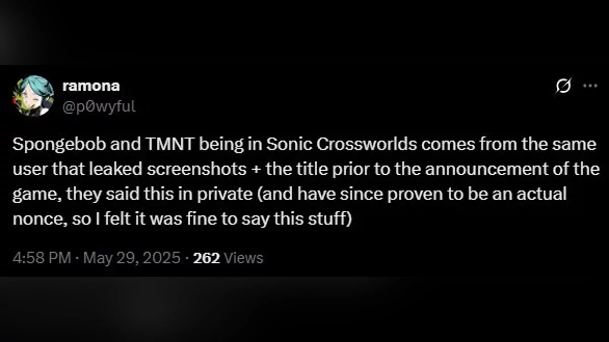 В сети появился слух, что в грядущей игре Sonic Racing: Crossworlds в качестве гостевых персонажей могут появиться Черепашки-ниндзя и Спанч Боб. Этой информацией поделился инсайдер p0wyful, который ранее уже публиковал утечки из игры.