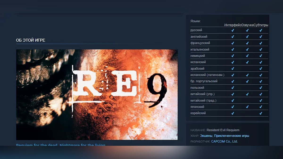 Анонсированный на Sumer Game Fest 2025 хоррор Resident Evil: Requiem обзавёлся страницей в Steam. Там же Capcom раскрыла список локализаций — а вот системные требования придётся подождать.
